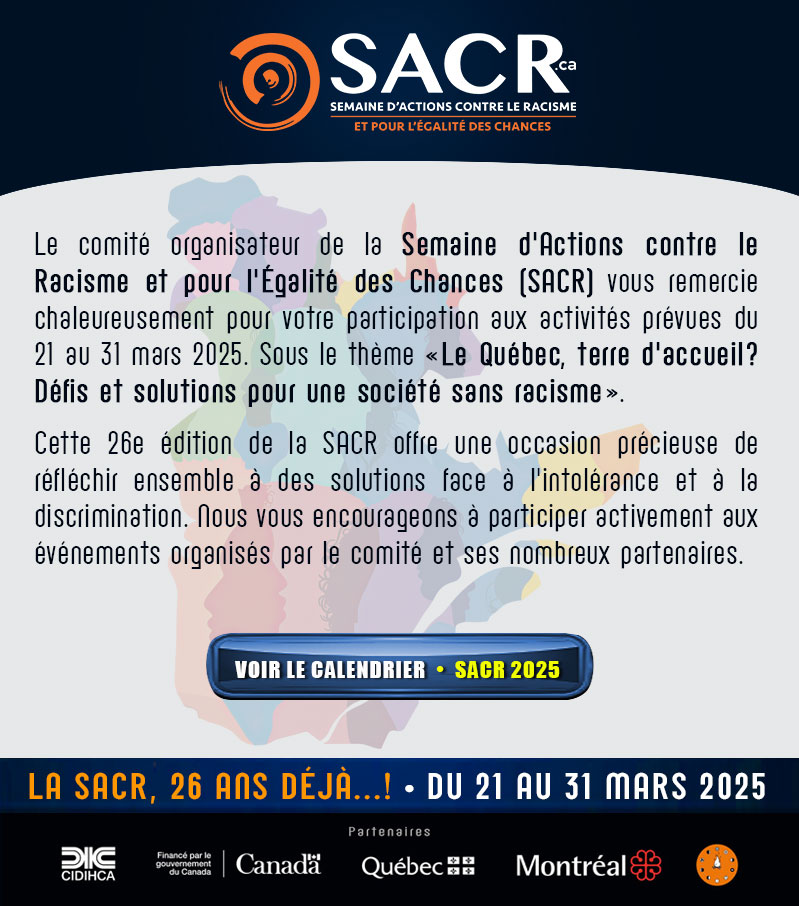 The Week of Action Against Racism and for Equal Opportunities (SACR) was created in the year 2000 to mark the International Day for the Elimination of Racial Discrimination, proclaimed by the United Nations General Assembly. Under the auspices of CIDIHCA, its primary goal is to prevent and combat exclusion based on skin color, ethnic origin, or nationality. This goal is pursued through activities that foster informed public dialogue on racism and diversity and aim to bring together all people living in Quebec, regardless of their origin—whether they are from Indigenous peoples or immigrant communities, from the colonial era to the present day.