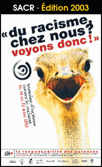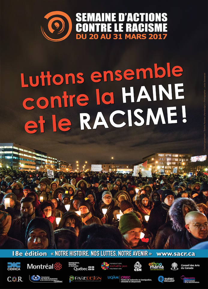 SACR-2017, 18e ÉDITION : Cette édition intitulée «Luttons ensemble contre la haine et le racisme!», cette 18° édition de la Semaine d'actions contre le racisme (SACR) envoie le message qu'il est temps de dépasser le vivre-ensemble pour en arriver à construire ensemble une société juste où l'égalité des citoyens soit reconnue dans les faits. Nos luttes, dont les souvenirs sont souvent douloureux, ont abouti à une société où la démocratie est en devenir. Il nous revient de la faire progresser en accordant une représentation équitable aux diverses minorités afin que toutes les voix se fassent entendre. Pour combattre le repli identitaire aussi bien que l'égocentrisme, qui constituent des menaces à notre devenir collectif, nous devons nous rapprocher pour poursuivre ensemble, peu importe d'où venaient nos ancêtres, la construction d’une société basée sur l'égalité des citoyens et des citoyennes.