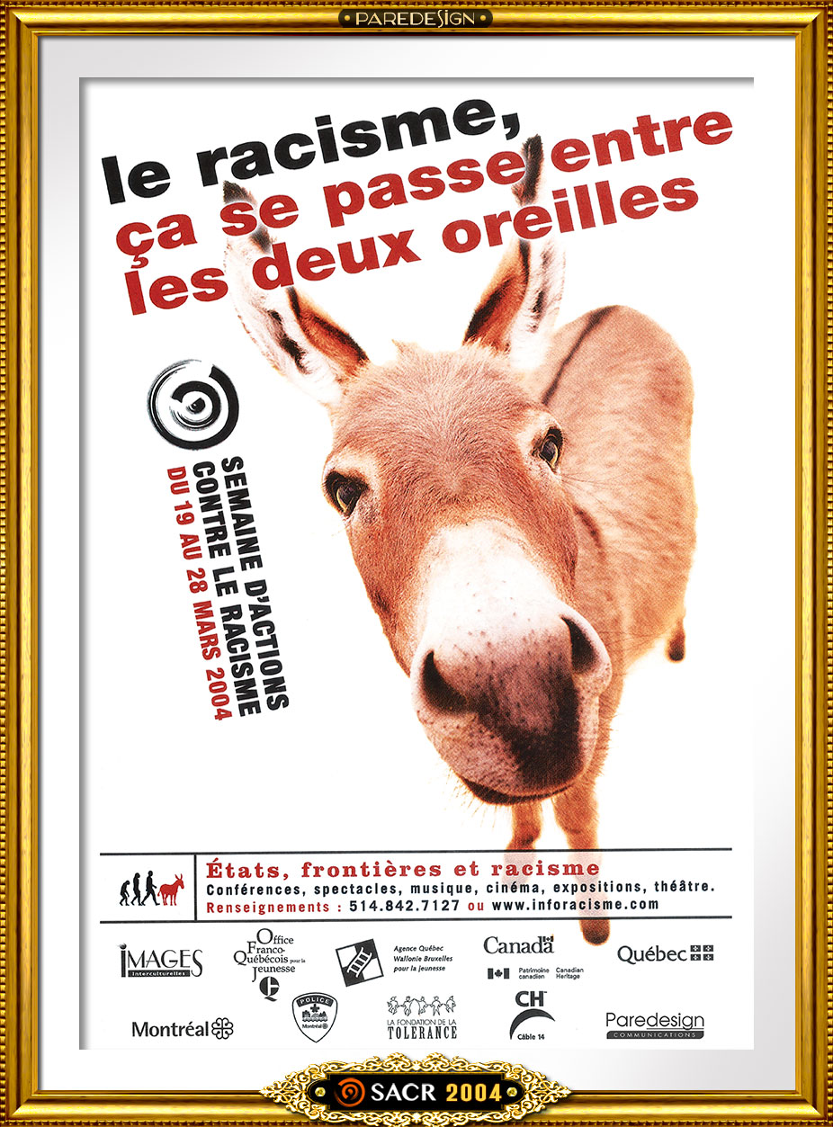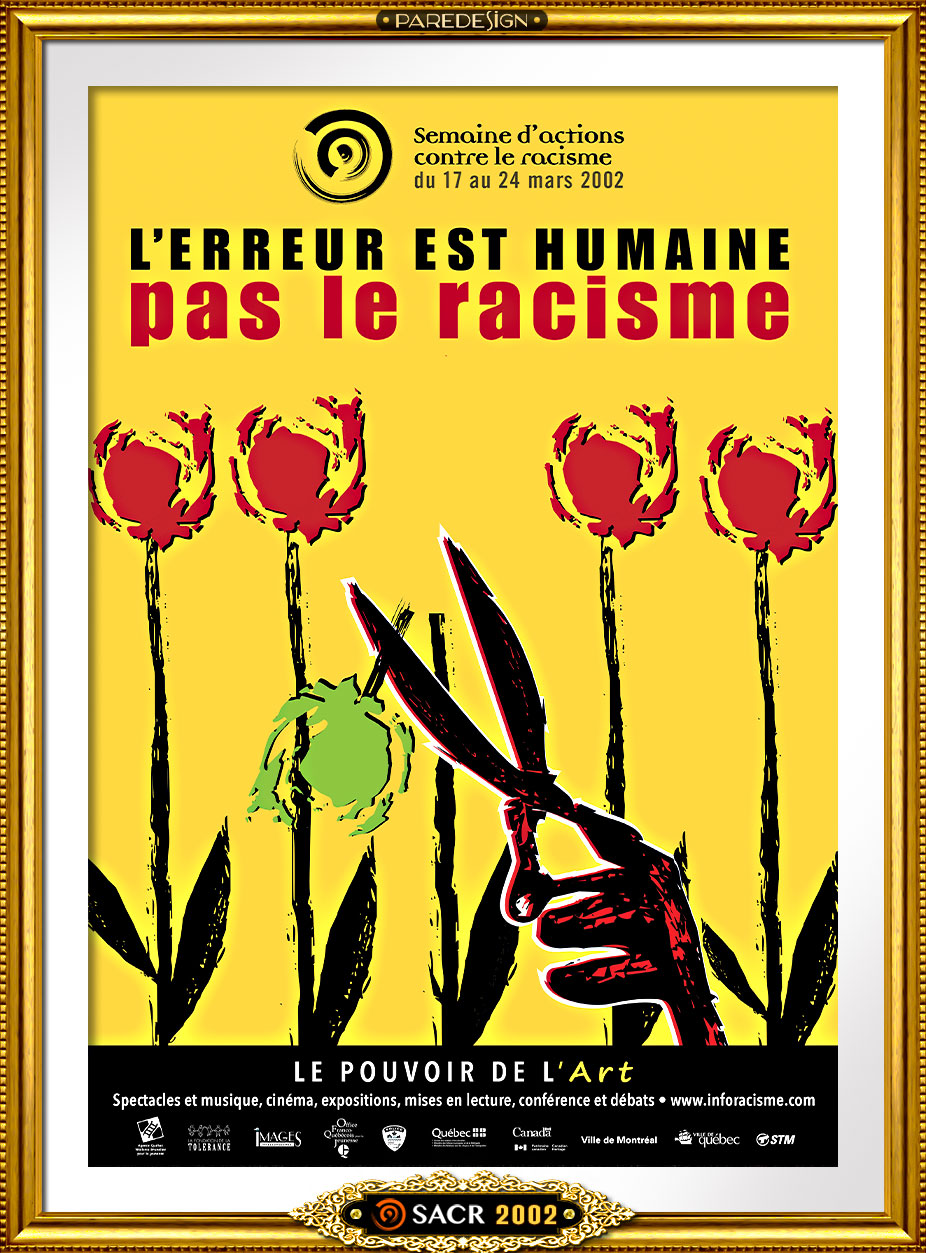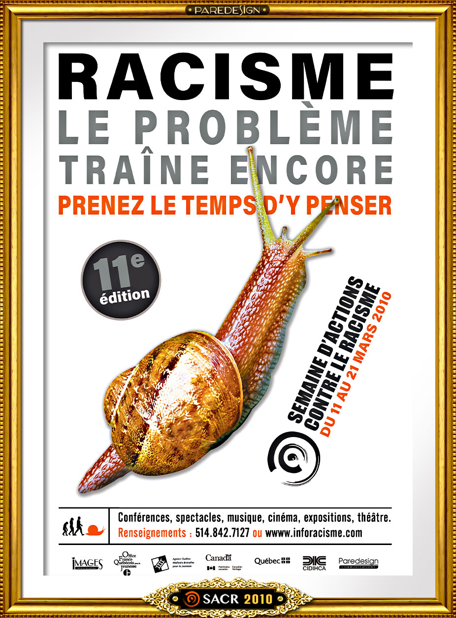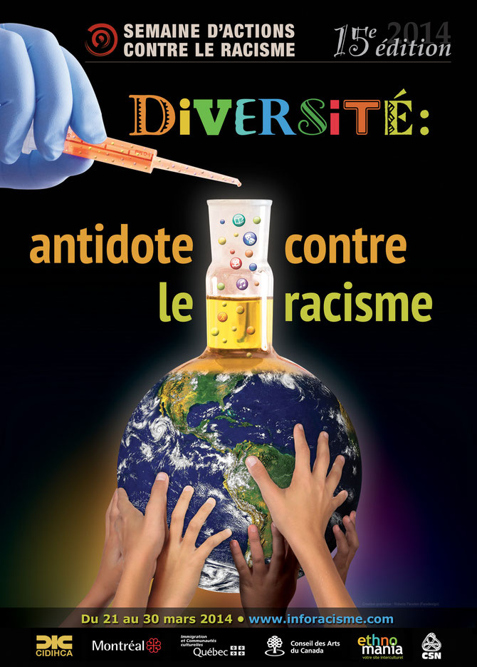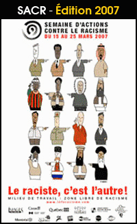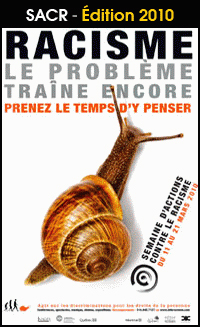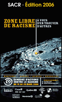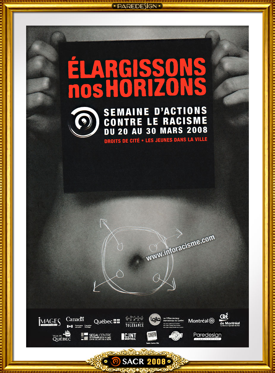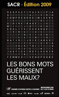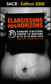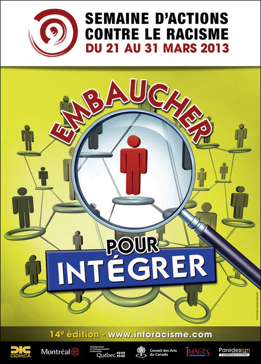 SACR-2013, 14e ÉDITION : En 2013 marque la 14e année de la Semaine d’Actions Contre le Racisme. Le thème de cette édition est «Embaucher pour intégrer». L’intégration des immigrants et des minorités racialisées sur le marché du travail est un impératif qui contribue au développement économique du Québec. La 14e Semaine d’Actions Contre le Racisme salue ses partenaires de Montréal, de Québec, de Gaspésie et de partout ailleurs. Ce sont vraiment eux les auteurs de cet événement.