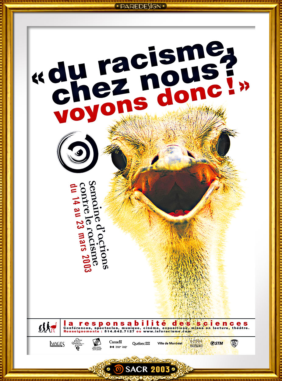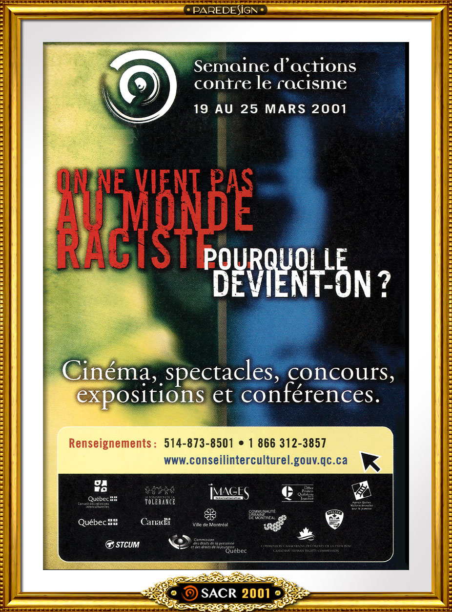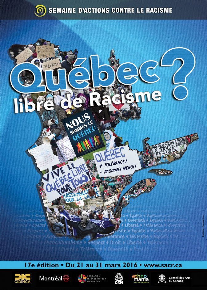 SACR-2016, 17e ÉDITION : Cette édition de la SACR intitulée «le Québec libre de racisme?», nous rappelle la nécessité de construire un Québec plus inclusif, plus uni et plus fort. La lutte contre le racisme est également inséparable des règles de fonctionnement des institutions. Ces règles doivent prendre en compte les facteurs qui privilégient et renforcent les relations de dialogue et d’ouverture à l’autre. Le racisme est un fléau, un frein à la démocratie. Le racisme et l’exclusion sont autant d’expressions de comportements et d’attitudes qui ne doivent pas nous laisser indifférents. Il nous faut donc libérer le Québec du racisme, de l’antisémitisme et de l’islamophobie qui sont encore présents et se manifestent de diverses façons dans les territoires de notre quotidien, au travail, à l’école, dans le système judiciaire.