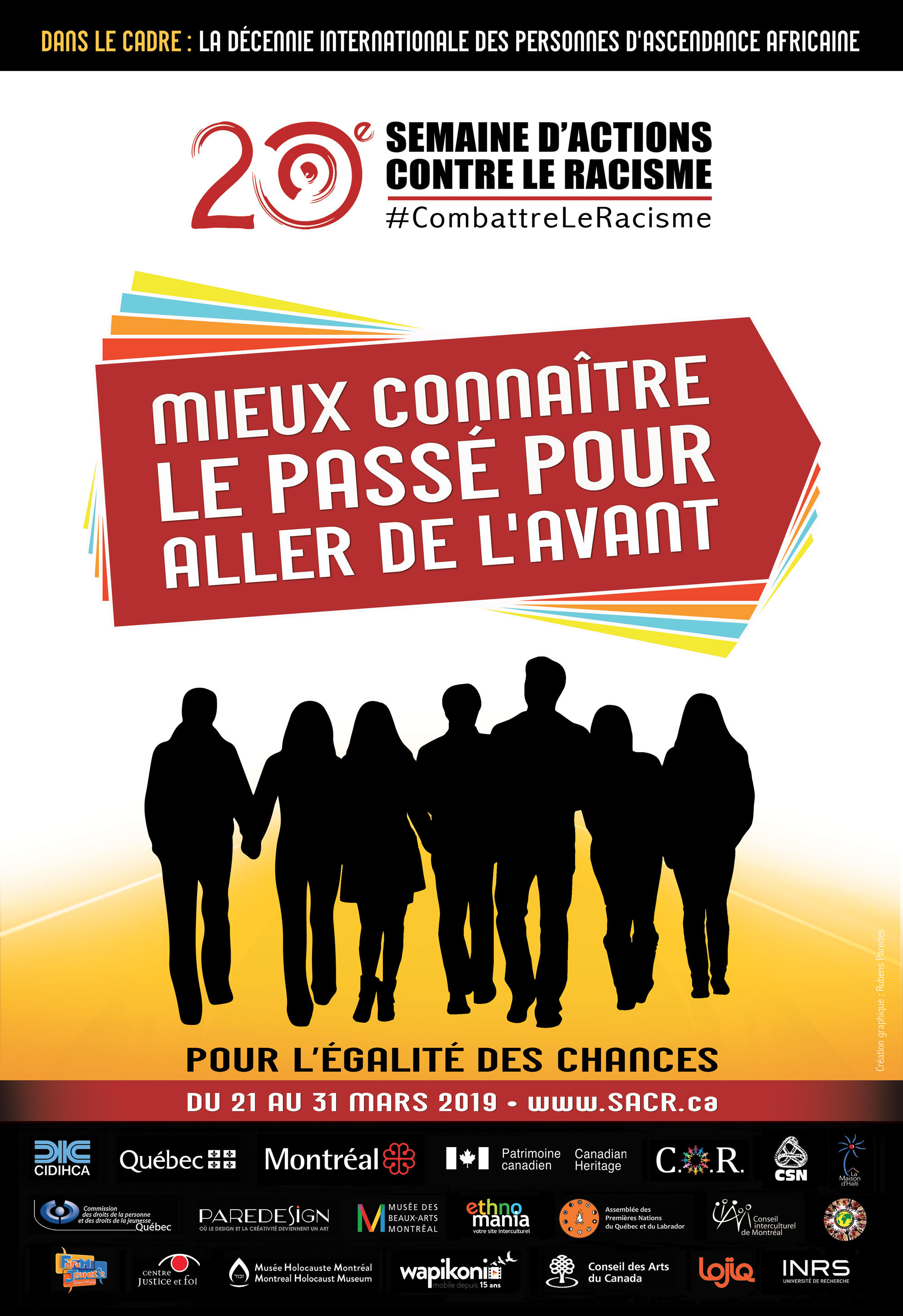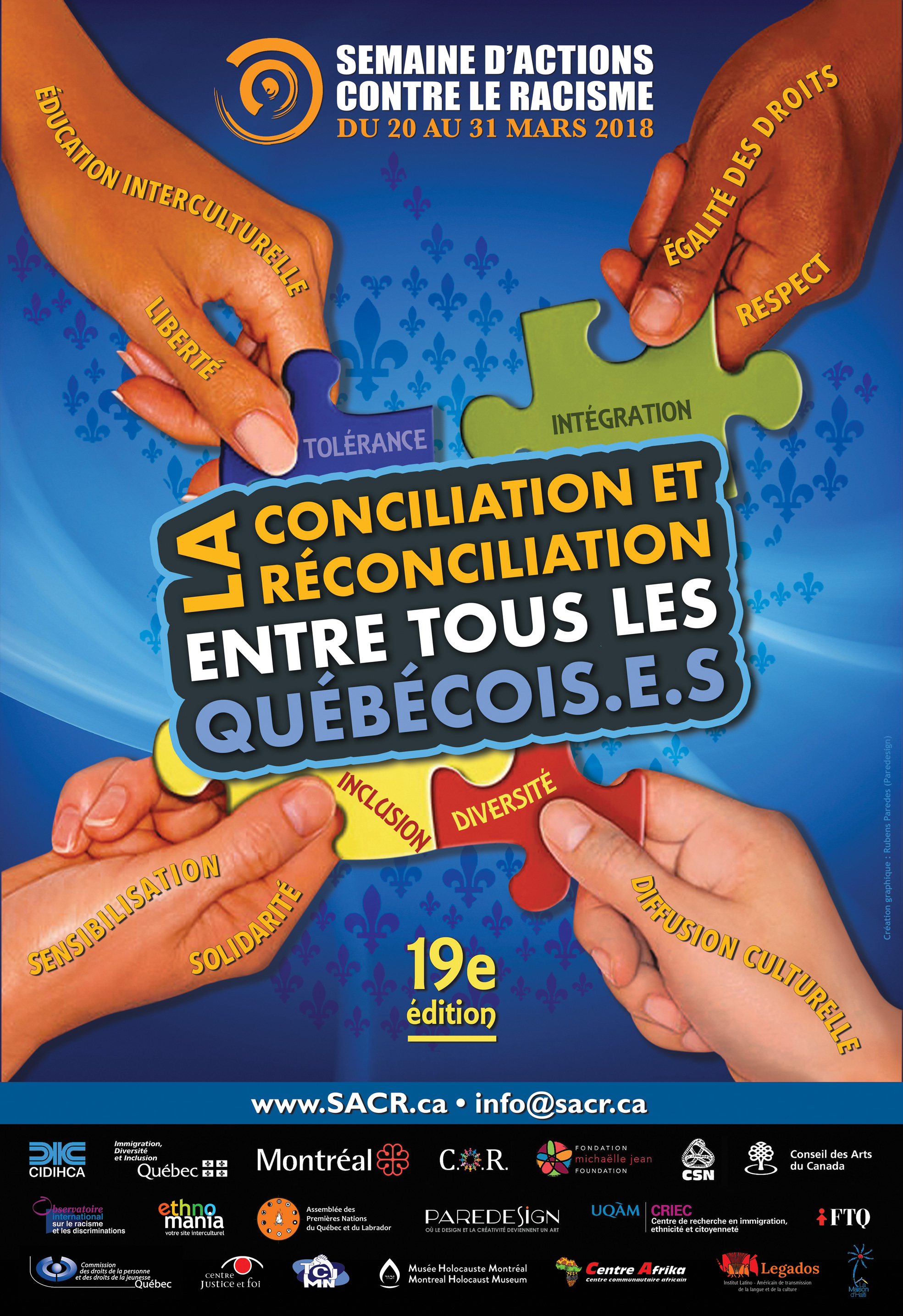 SACR-2018, 19e ÉDITION : Cette édition de la Semaine d'actions contre le racisme, intitulée «La conciliation et la réconciliation entre tous les Québécois.e.s», vise principalement à favoriser l'inclusion sociale de tous les Québécois et Québécoises, quel que soit l'origine de leurs ancêtres. Dans cette optique, le thème de la SACR 2018 se concentre sur «La conciliation et la réconciliation entre tous les Québécois.e.s».