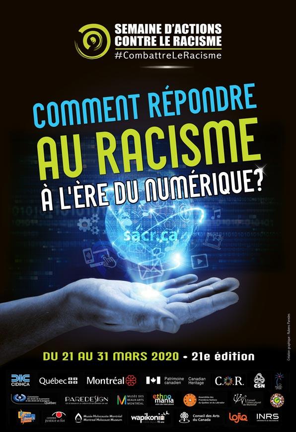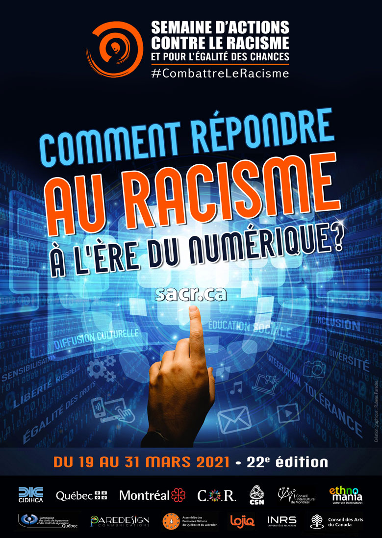 SACR-2021, 22e ÉDITION : La 22e Semaine d’actions contre le racisme et l'égalité des chances (SACR) se déroulera du 19 au 31 mars 2021. Le thème de cette année « Comment répondre au racisme à l'ère du numérique? » vient à point durant cette période de pandémie et de confinement. Nous devons continuer à être solidaires face aux manifestations de haine contre les Autochtones. Le racisme, tout comme l’antisémitisme, l’islamophobie, la haine des Asiatiques, continue de se manifester dans les institutions, mais aussi dans les domaines de notre quotidien. Nous devons être vigilants et combattre toute forme de discrimination qui limite l’égalité des chances. Montréal doit considérer la diversité comme un atout.