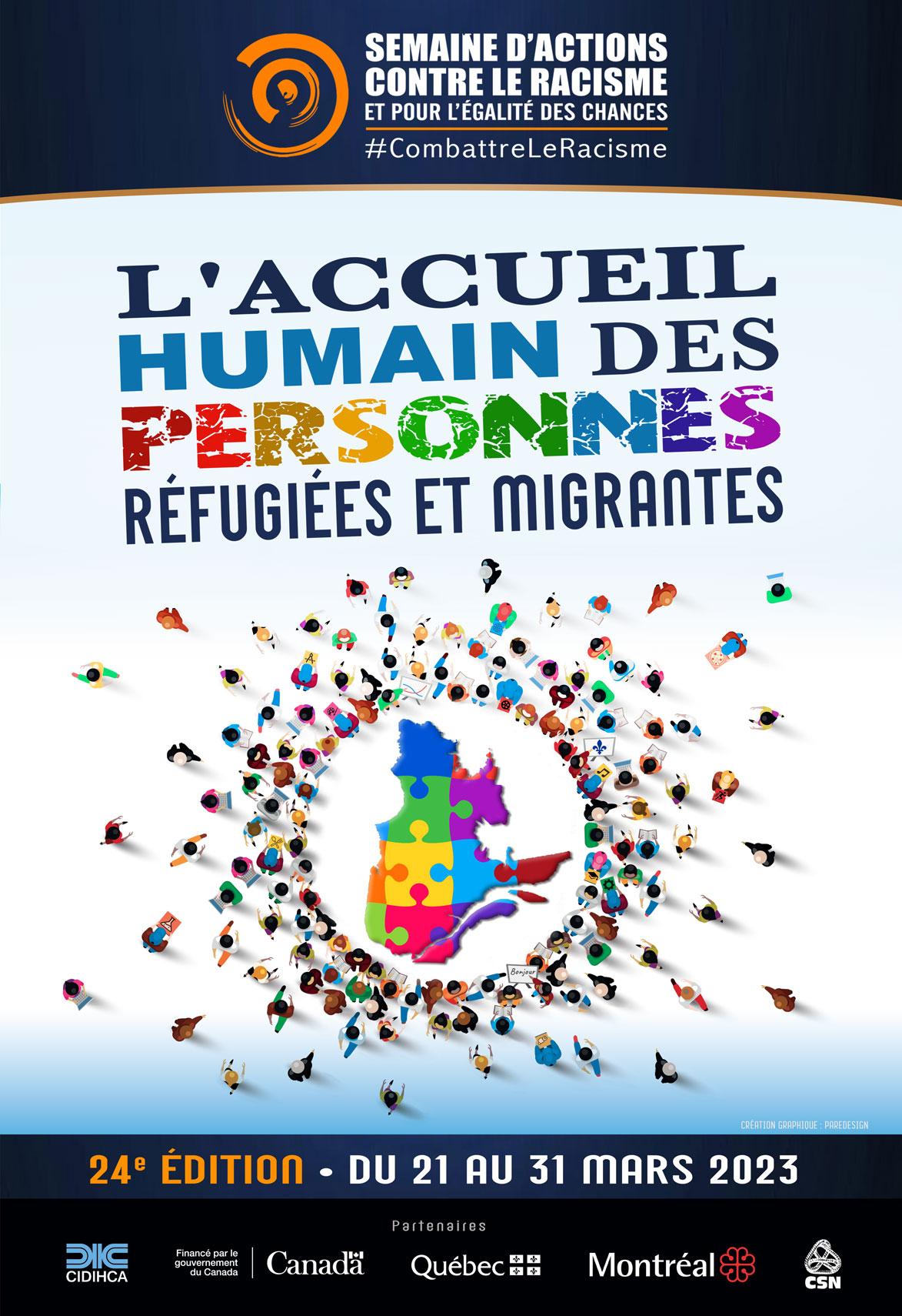 Les événements tragiques que les médias rapportent ont amené notre Conseil consultatif à déterminer que le thème de la SACR 2022 est « L'accueil des réfugié.e.s et des migrant.e.s au Québec ». La SACR 2022 est rendue possible grâce à la participation financière du gouvernement du Québec; Patrimoine canadien; Ville de Montréal; CIDIHCA; CSN.
