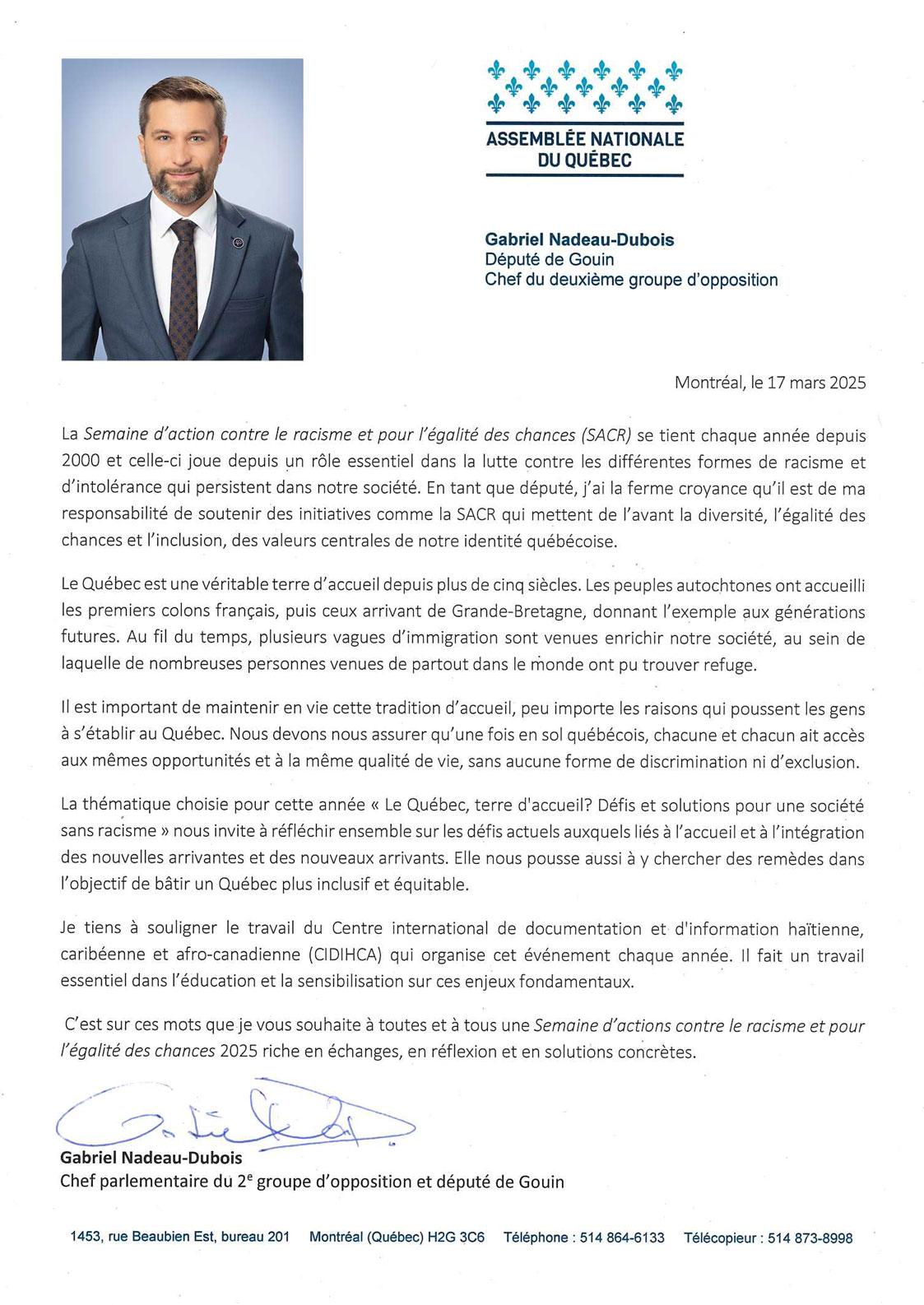 MESSAGE DE M. GABRIEL NADEAU-DUBOIS, Député de l’Assemblée nationale du Québec