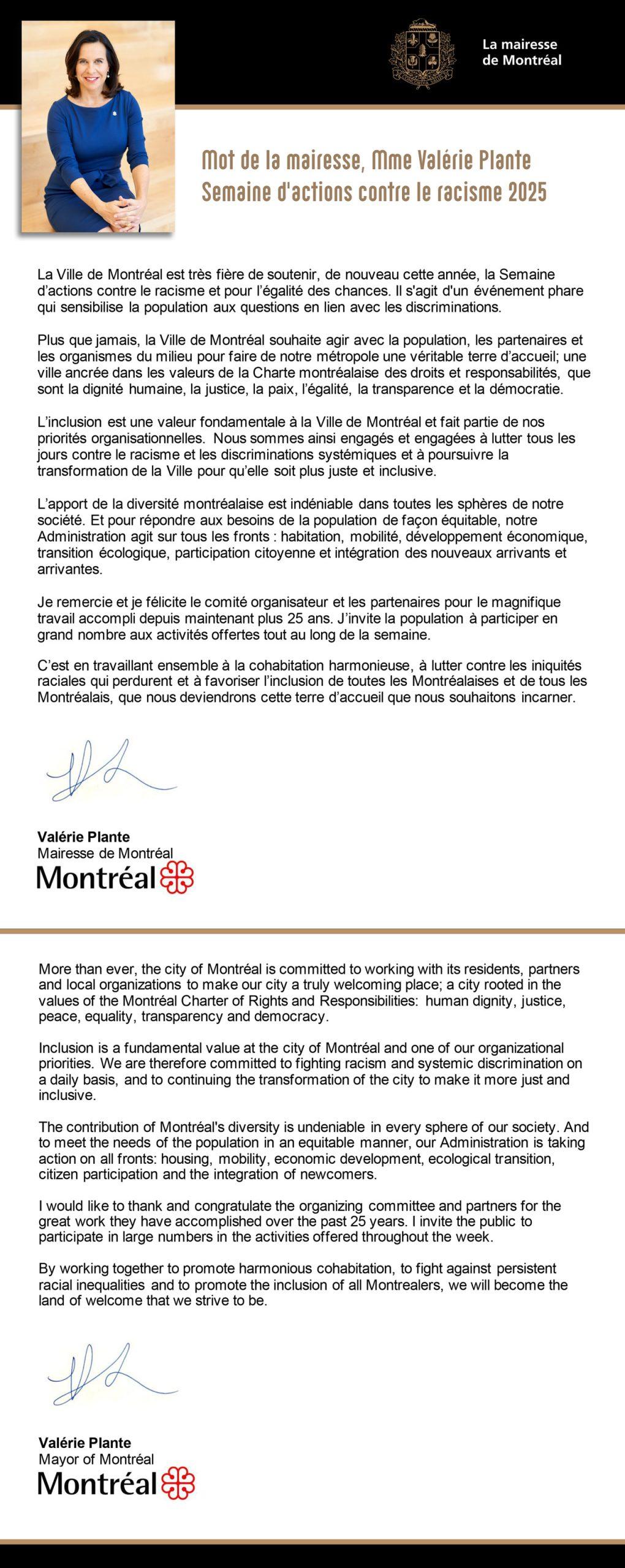 • MESSAGE DE MME VALÉRIE PLANTE, MAIRESSE DE MONTRÉAL •