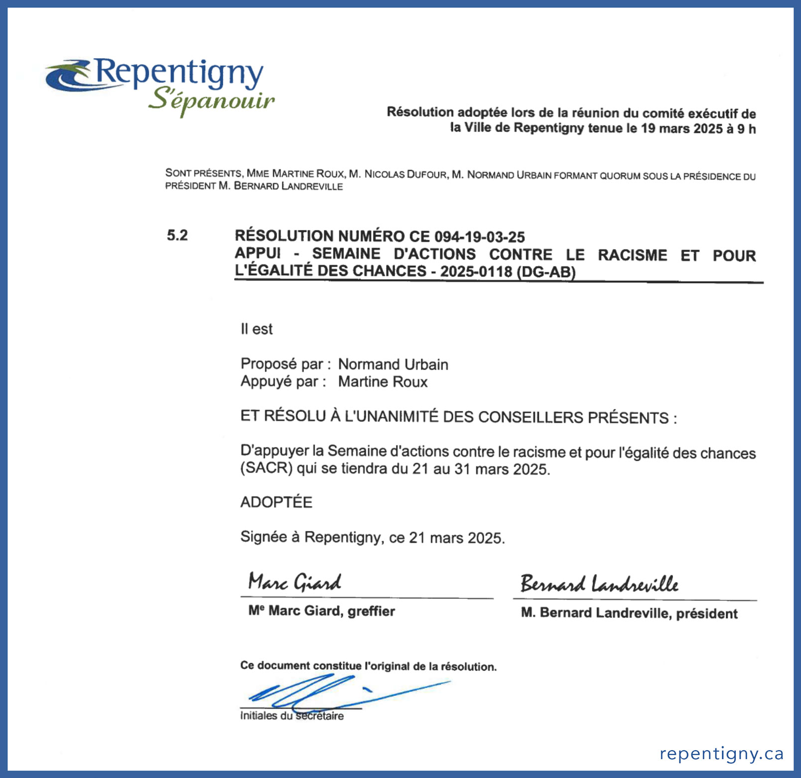 • RÉSOLUTION ADOPTÉE LORS DE LA RÉUNION DU COMITÉ EXÉCUTIF DE REPENTIGNY •