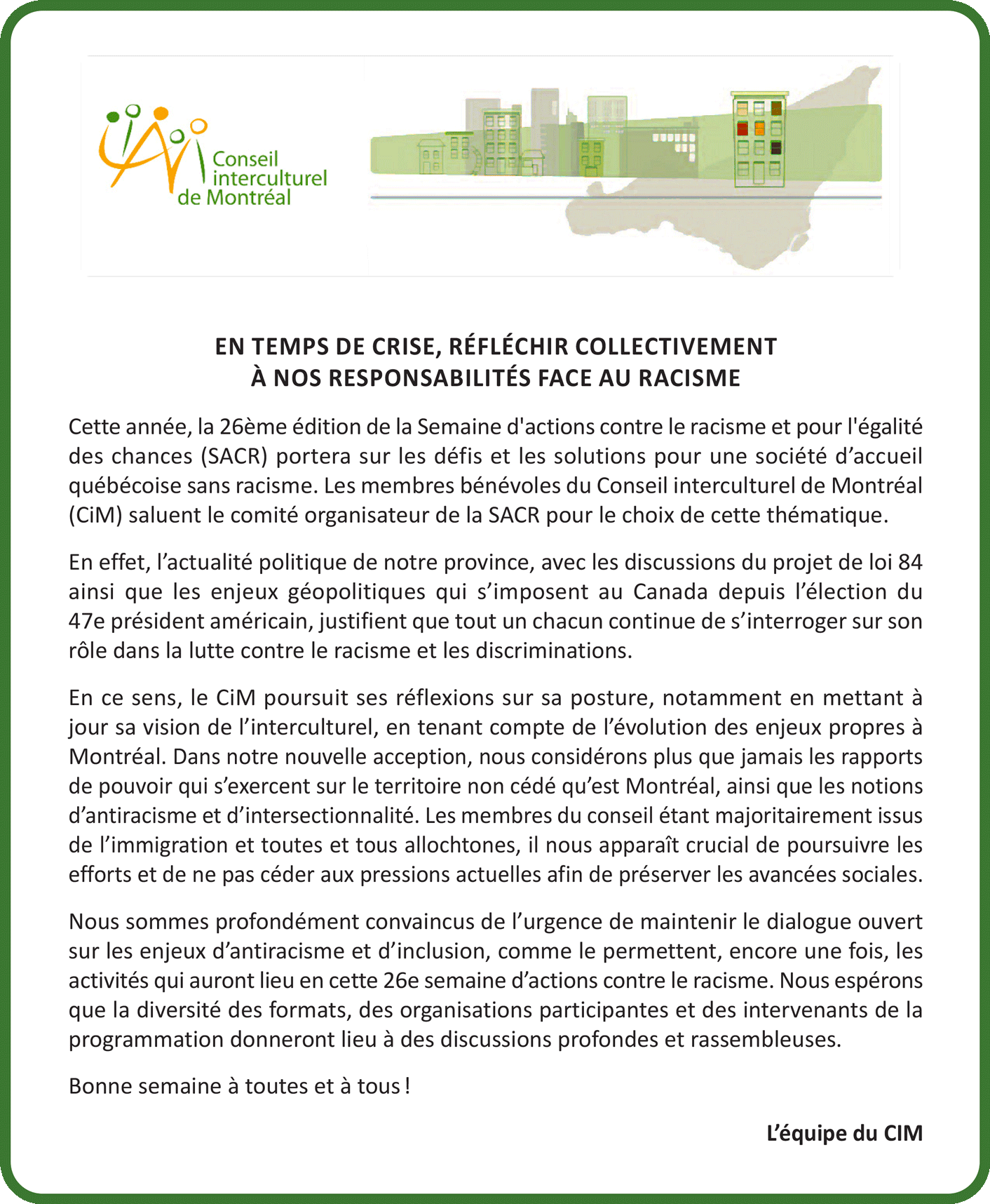 • MESSAGE DU CONSEIL INTERCULTUREL DE MONTRÉAL (CIM) •